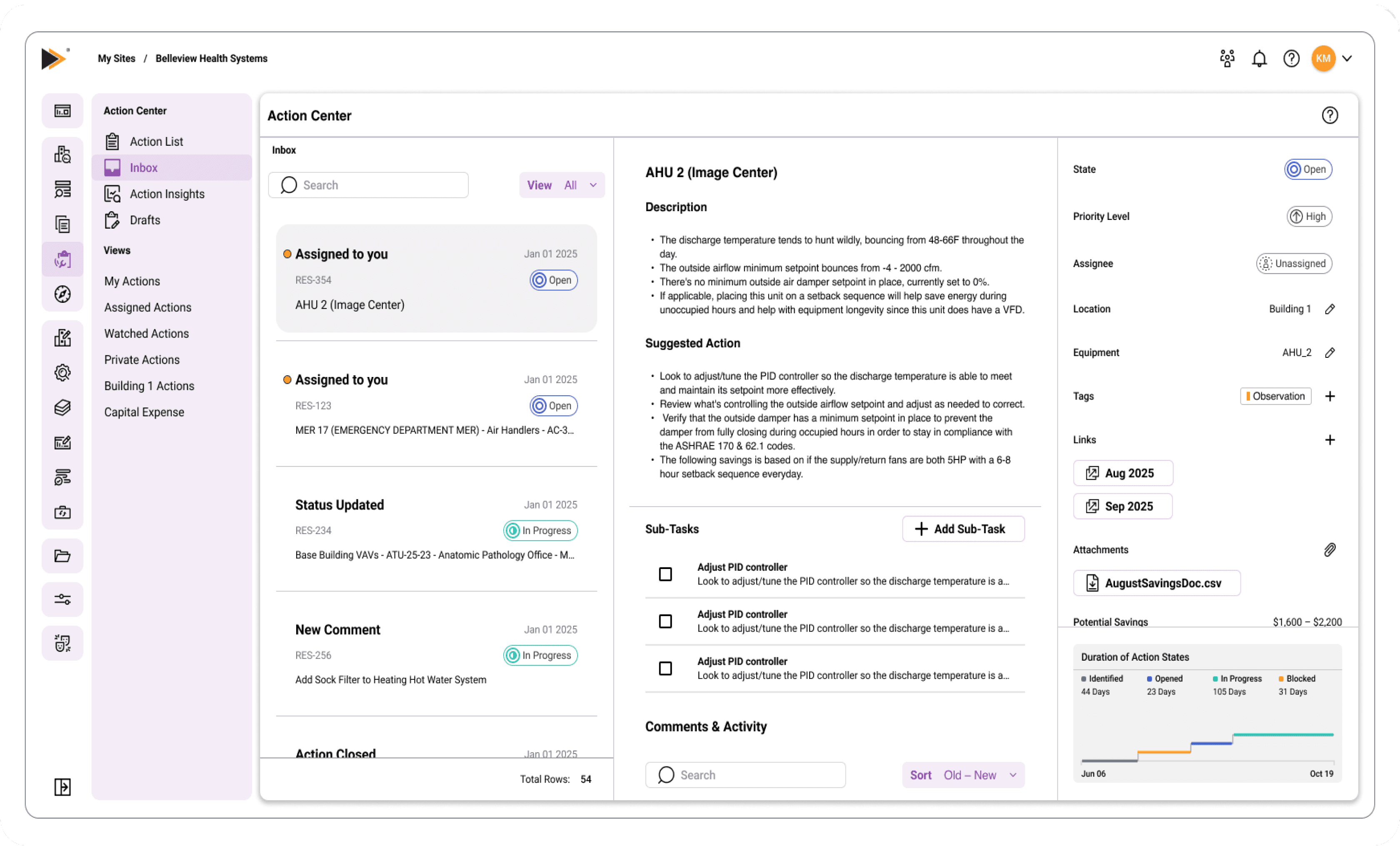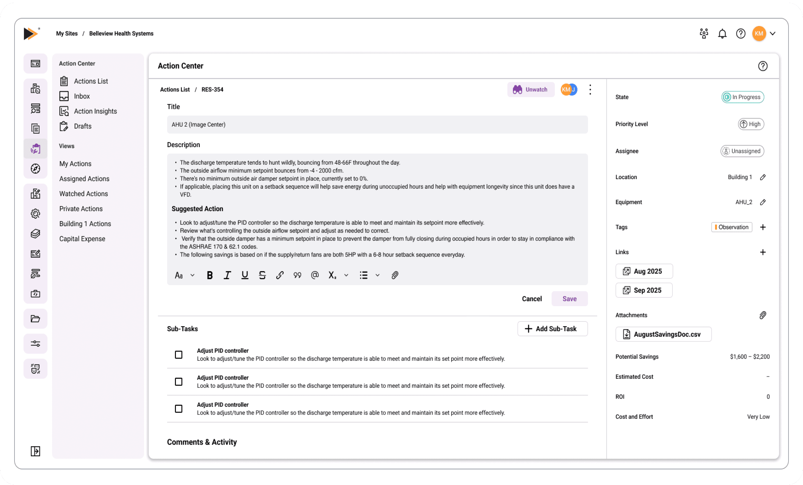 An Action Item represents a specific task or opportunity for improving building operations, identified through analytics and reports.