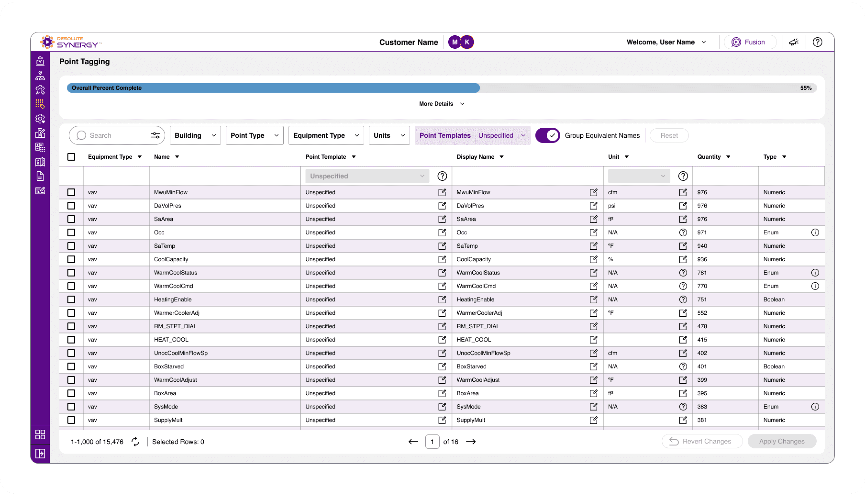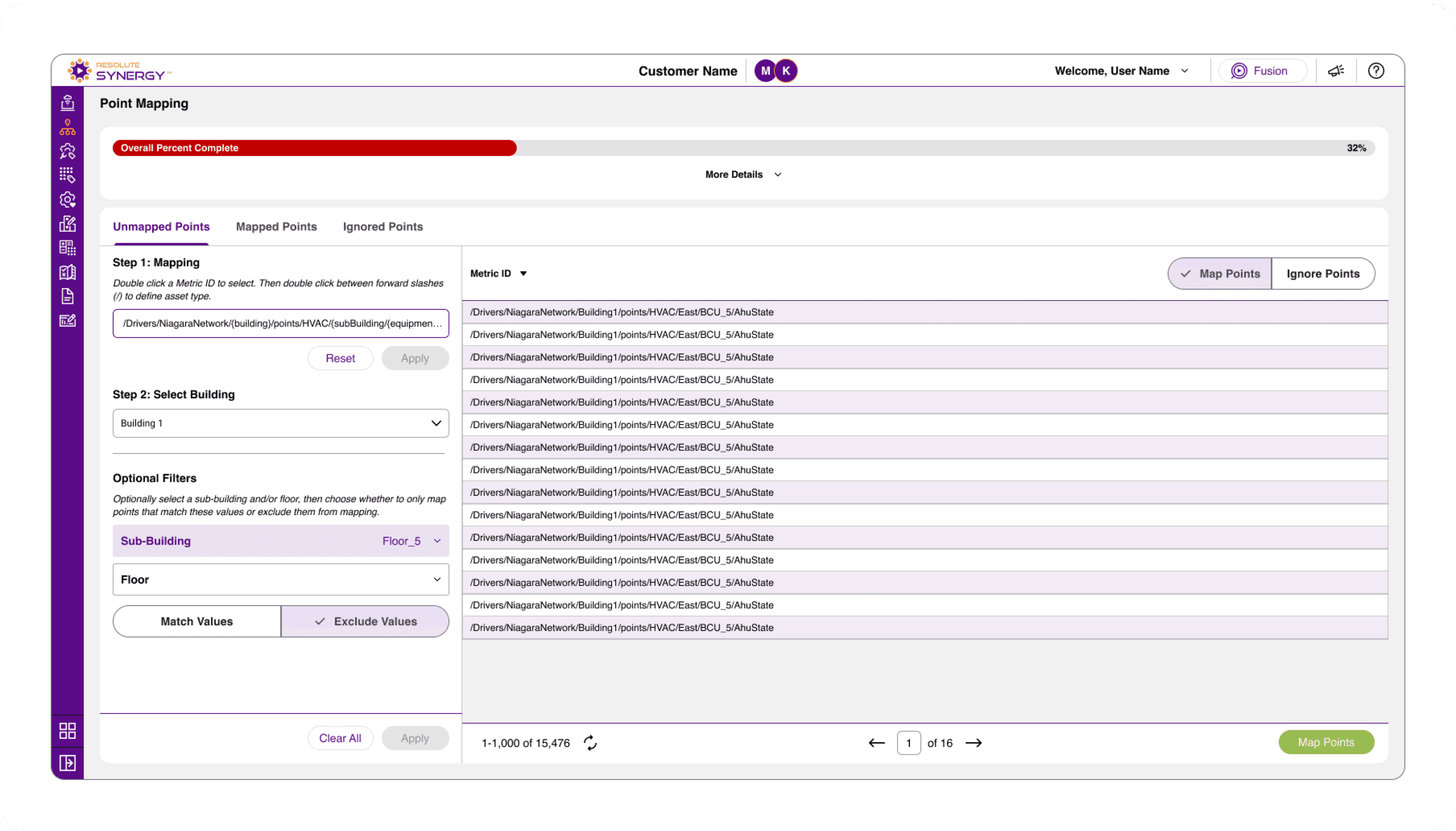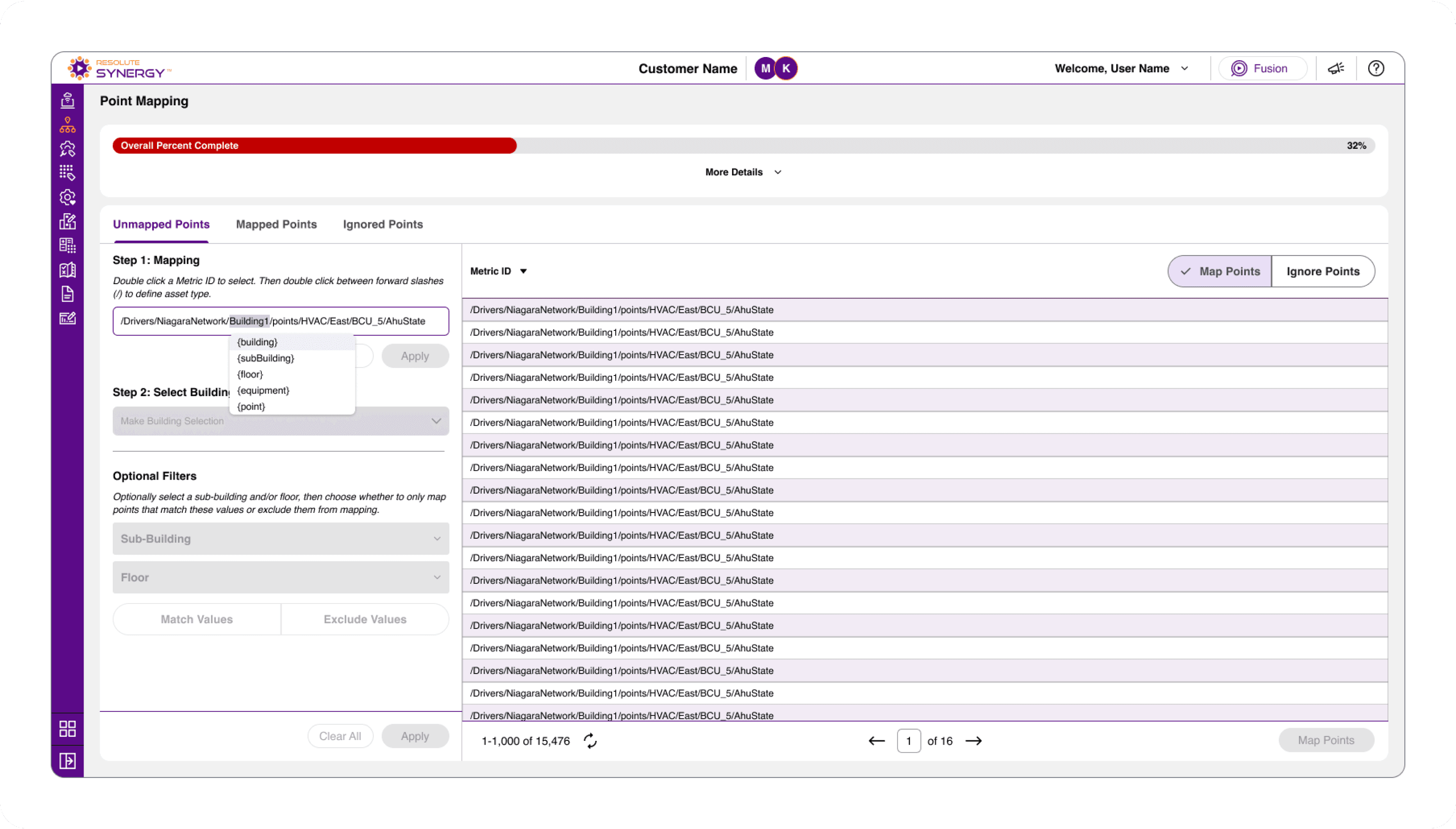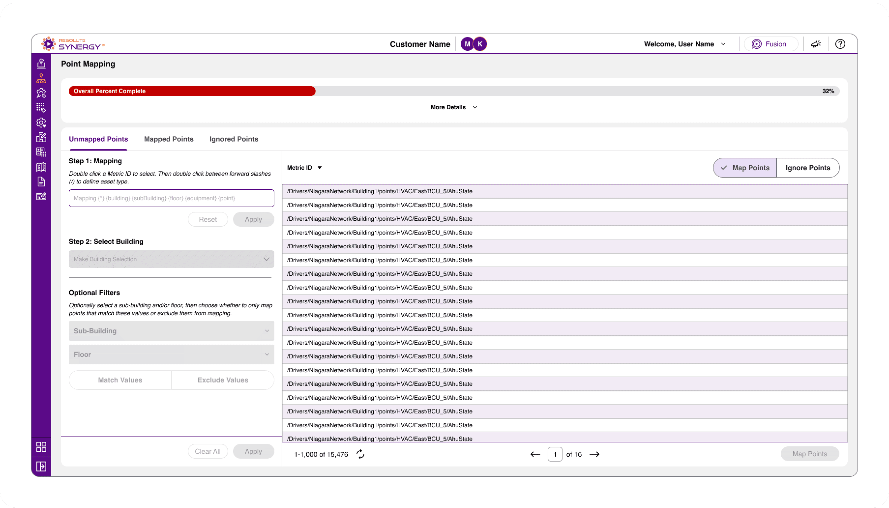 Users start with a full dataset of unmapped points, where each row represents a unique Metric ID pulled from the building’s automation system.